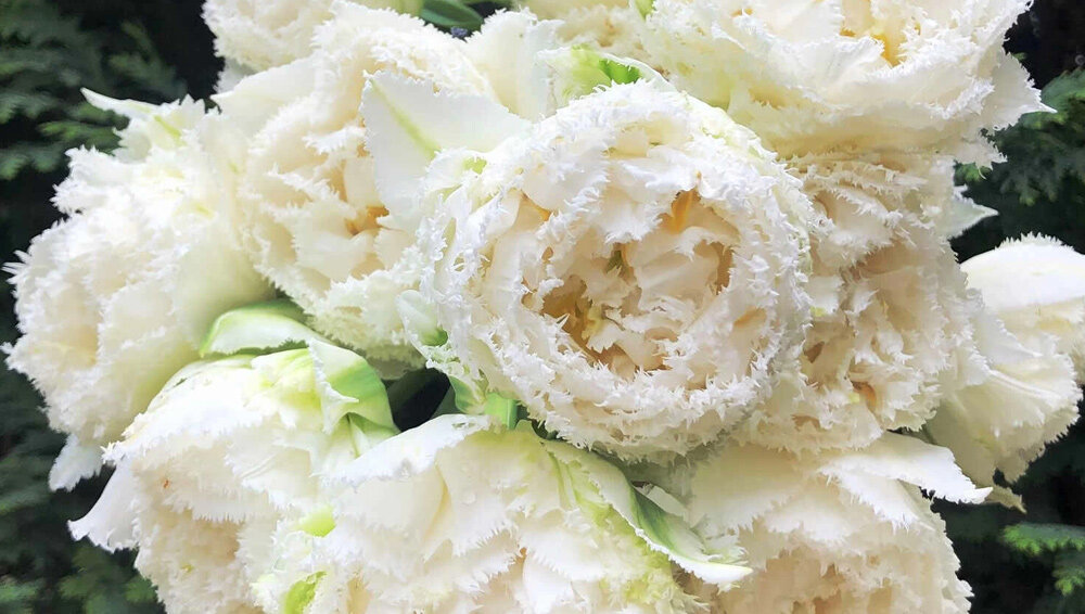 Уникальный сорт – махровый и одновременно бахромчатый, с огромными (до 12 см в диаметре) цветками. Состоит из многочисленных кремово-белых лепестков, образующих красивый ажурный узор.