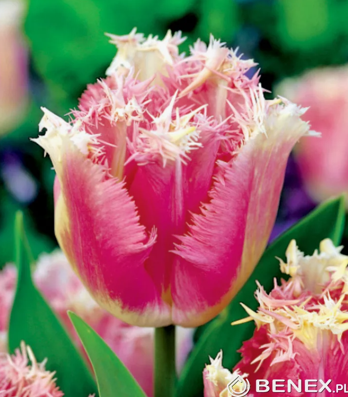 Тюльпан «Фэнси Фриллс» - бесподобный двухцветный многолетник, цветущий в мае. Растение отличается от многих других своими несравненными бутонами – их лепестки и донце окрашены в сливочный цвет, а по краю лепестков проходит шикарная кайма розового цвета. Цветы дополнительно украшены игольчатой бахромой, представленной в том же цвете, что и края лепестков. Цветение может длиться около 3 недель.