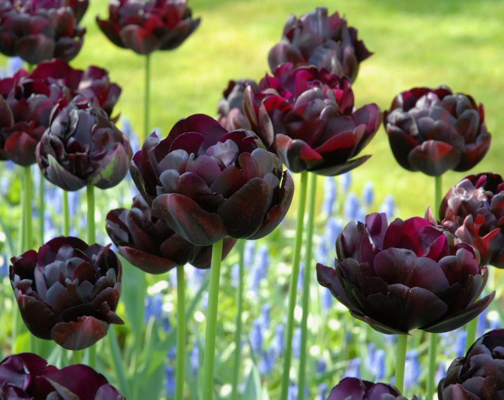 Тюльпан «Блек Хиро» - самый экстравагантный представитель поздних махровых тюльпанов. Это растение отличается высоким ростом до 60 см и крупными цветками диаметром до 11 см. Они окрашены в темно-фиолетовый, почти чёрный цвет. Края многочисленных лепестков обвиваются вокруг бутона, как маленькие лианы.