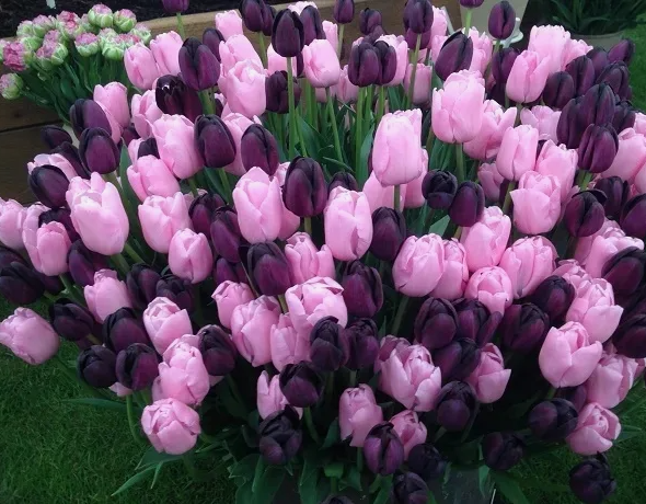 Тюльпан Куин оф Найт - наиболее зрелищный сорт среди темных тюльпанов. Цветы растения представлены в черно-бордовом цвете, который одновременно напоминает окраску спелой вишни и баклажана. Диаметр цветов – от 7 до 9 см. Цветоносы могут достигать высоты 45 – 65 см. Цветоносные стебли крепкие, не страдают от сильных порывов ветра или проливных дождей.