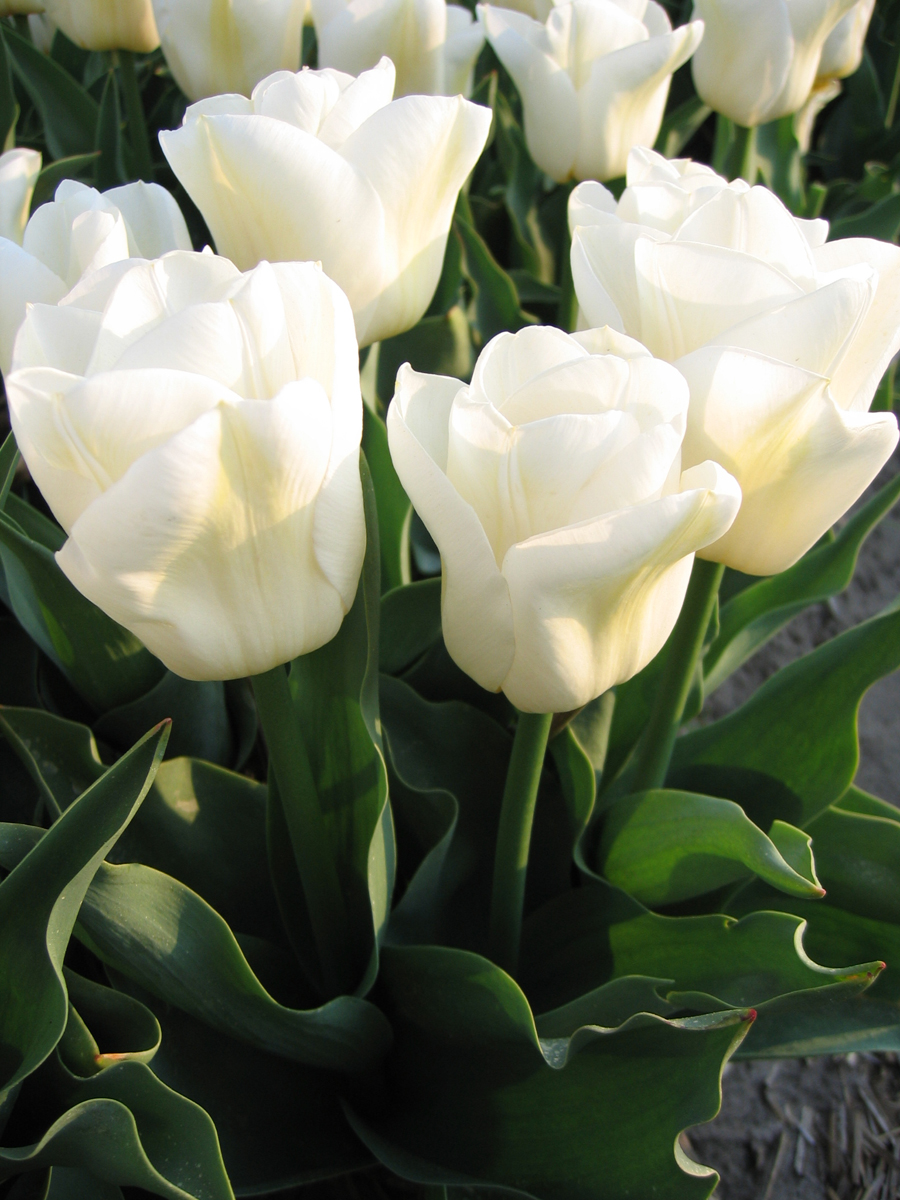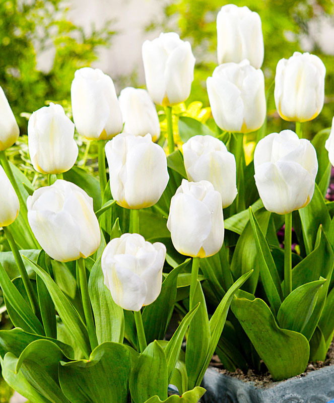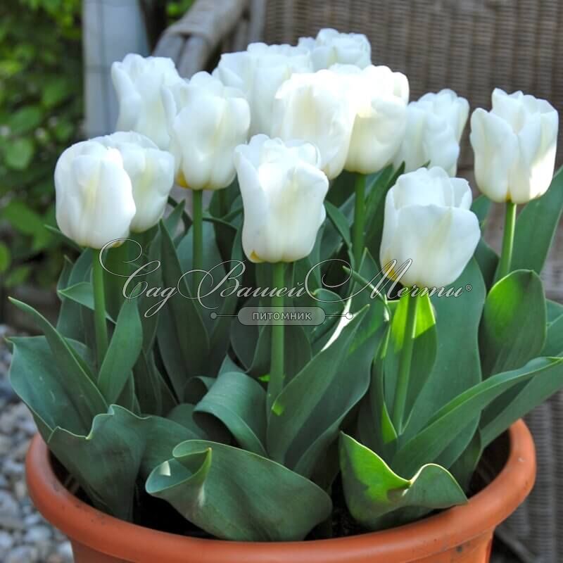 Тюльпан «Калгари» - очень нежный сорт раннецветущих луковичных многолетников. Чистые, как снег, белые бутоны появляются уже в начале апреля. Часто на лепестках цветов присутствует чуть заметная кремовая окантовка. По размеру цветы довольно крупные – их диаметр составляет от 7 до 10 см. Невысокие кустики (до 25 см) часто выращивают в горшках, они отлично подходят для кашпо. Сорт идеален для посадки на переднем плане клумбы. Это апрельское чудо довольно долго цветет – наслаждаться цветением можно до 20 дней.