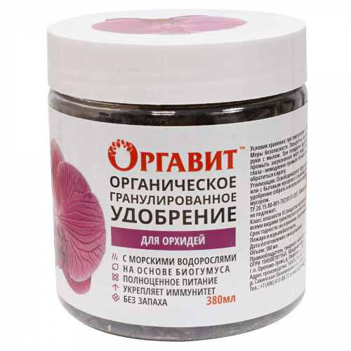 Оргавит для орхидей – органическое гранулированное удобрение с морскими водорослями на основе биогумуса для всех видов орхидей. Удобрение улучшает структуру почвы, обогащает макро- и микроэлементами, обеспечивает обильное и длительное цветение, высокий тонус, укрепляет иммунитет, увеличивает количество и яркость бутонов. Содержит в составе различные биологически активные вещества (фитогормоны, аминокислоты, гуминовые кислоты), которые способствуют росту и развитию.