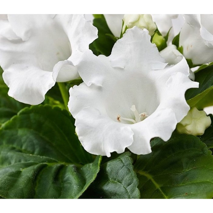 Глоксиния садовая "Монблан" - это клубневое растение с крупными махровыми цветками кристально-белого цвета. Её элегантные соцветия привносят в композиции ощущение свежести и торжественности.