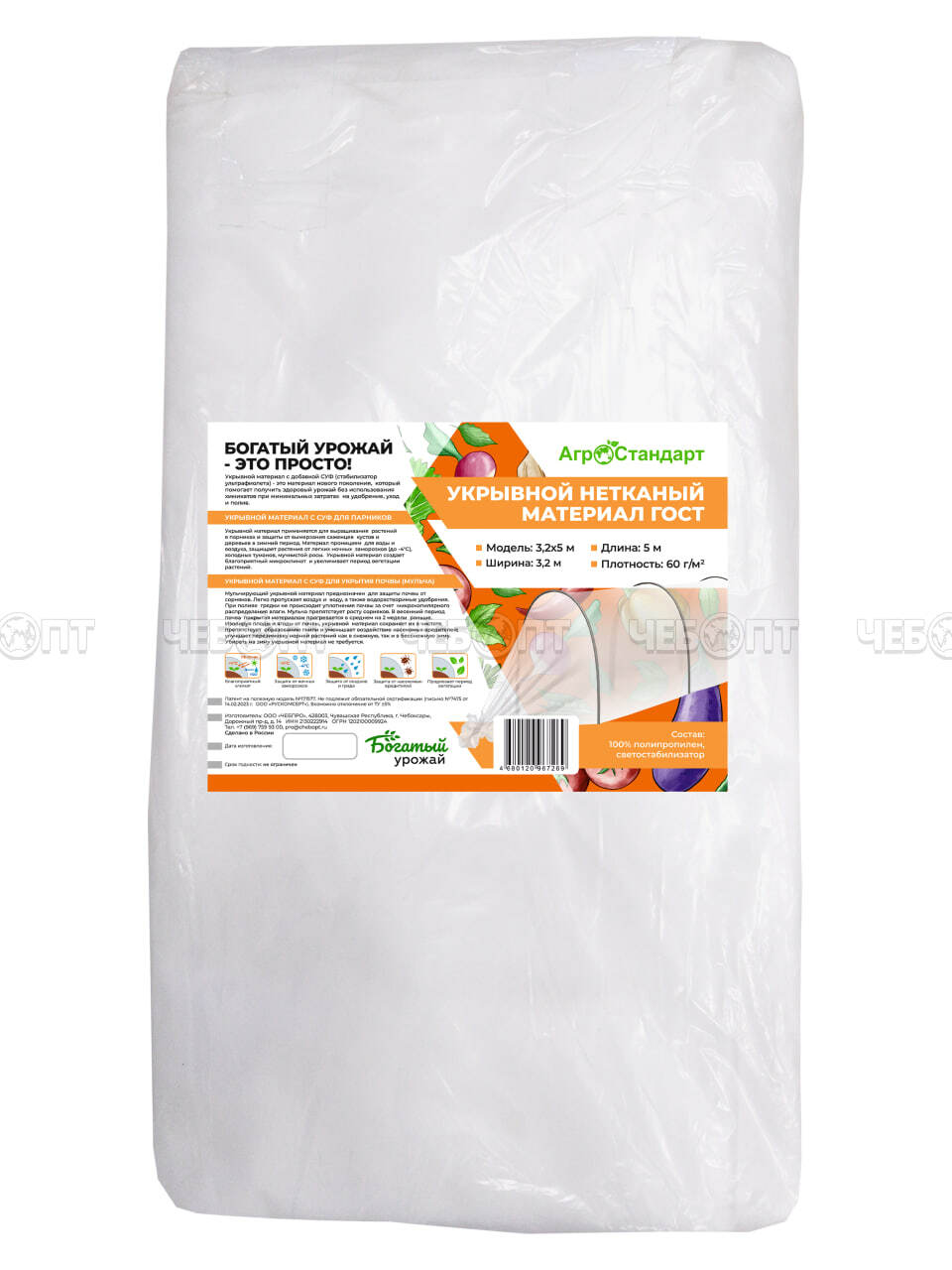 5М Укрывной материал (спанбонд) АгроСтандарт плот. 60 (ширина 3,2 м, длина 5 м) с СУФ ГОСТ [5] СобПр