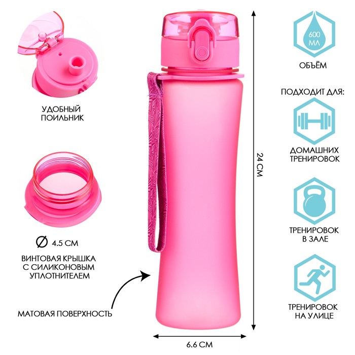 Бутылка для воды, 600 мл, с поильником, розовая