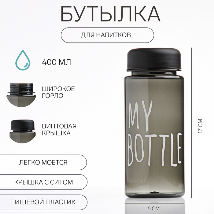 Стильная и практичная бутылка для воды от бренда My Bottle объемом 400 мл создана специально для активных людей. Ее размеры 17 x 6 см позволяют без труда разместить ее в рюкзаке, спортивной сумке или автомобиле. Изготовленная из полупрозрачного материала, эта бутылка дает возможность контролировать уровень жидкости, оставаясь при этом привлекательной внешне.