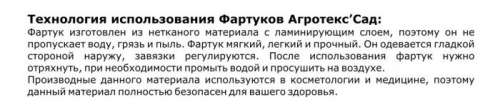 Фартук создан специально для тех, кто занимается выращиванием растений и уходом за ними. Изготовлен фартук из нетканого материала ярко оранжевого цвета и имеет ламинирующий слой, поэтому он защищает одежду от пыли, грязи и воды при выполнении различных работ на приусадебном участке или в питомнике.