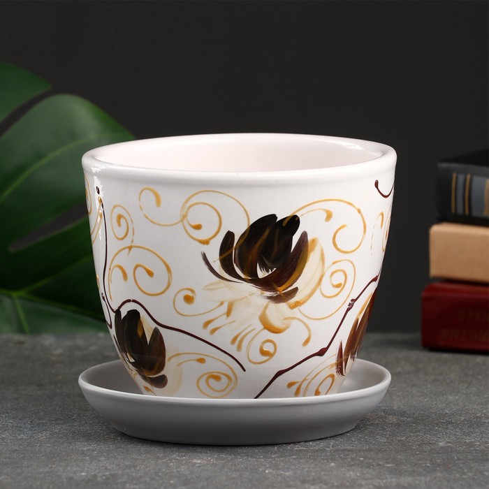 Горшок для цветов «Орхидея», 1 л, d=15 см, h=13 см, керамический, с поддоном, белый