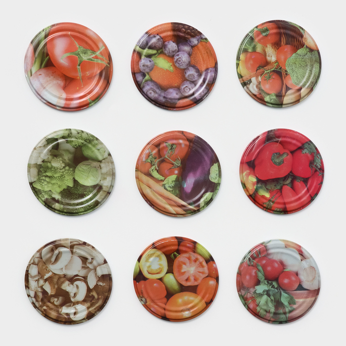 Крышка СКО1-82, литографированная (каждая крышка в столбике с литографическим изображением овощей, фруктов, ягод, грибов), изготовлена из белой жести и покрыта пищевым лаком. По внутреннему ободку крышки проходит резиновое пищевое уплотнительное кольцо для герметичного закрывания банки. Крышка полностью соответствует требованиям ГОСТ Р 51214-98 П.4.1., сертифицирована, прошла все необходимые санитарно-эпидемиологические исследования.