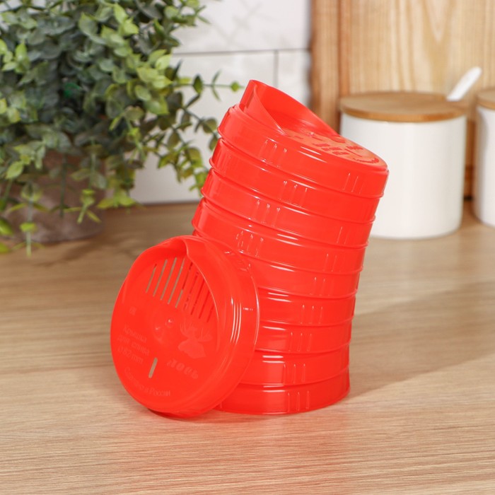 Крышка с отверстиями предназначена для удобного слива рассола при консервировании или при приготовлении компотов. Готовый компот удобно наливать через такую крышку, отделяя напиток от ягод и фруктов. Крышка изготовлена из безопасного сырья, разрешенного для контакта с пищевыми продуктами.