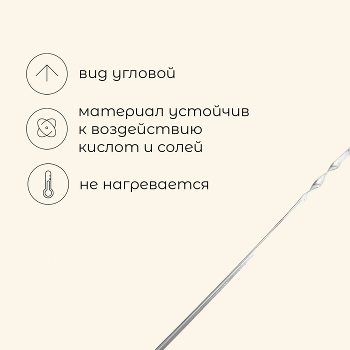 Шашлыки на шампурах — классическое и любимое угощение во время отдыха на природе. Стальная модель с никелевым покрытием не нагревается, устойчива к воздействию кислот и солей. Угловой шампур с витой ручкой держится в нужном положении, что позволяет правильно переворачивать и равномерно прожарить мясо.