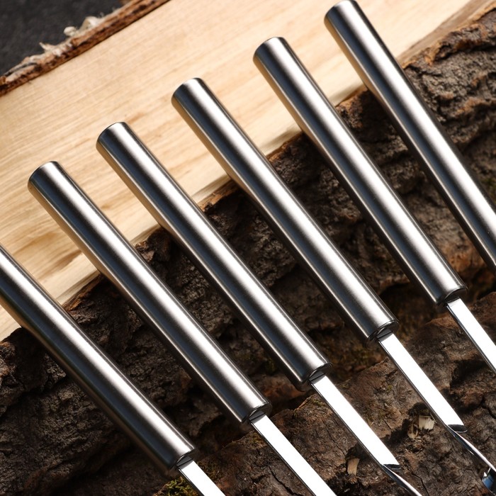 Набор предназначен для приготовления шашлыка: мяса, рыбы или овощей на открытом огне. Заостренные концы идеально нанизывают даже большие и жесткие куски мяса.