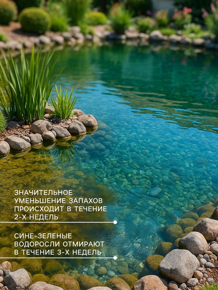 Органический биоактиватор, который уничтожает водоросли и очищает воду в декоративных водоемах. В теплой, богатой органическими веществами воде садовых водоемов водоросли могут развиваться очень быстро, при этом вода приобретает зеленый цвет, и часто неприятный запах. С помощью подобранных микроорганизмов и минералов, входящих в состав биоактиватора вы легко сможете содержать ваш водоем в порядке в течение всего сезона с апреля по октябрь.