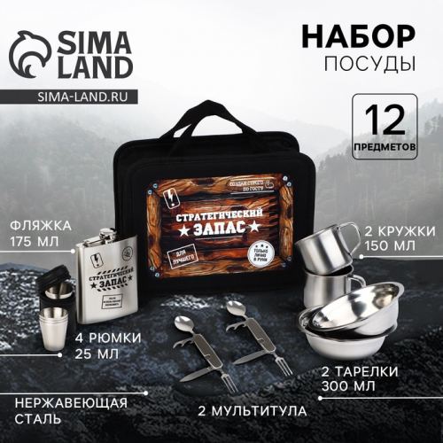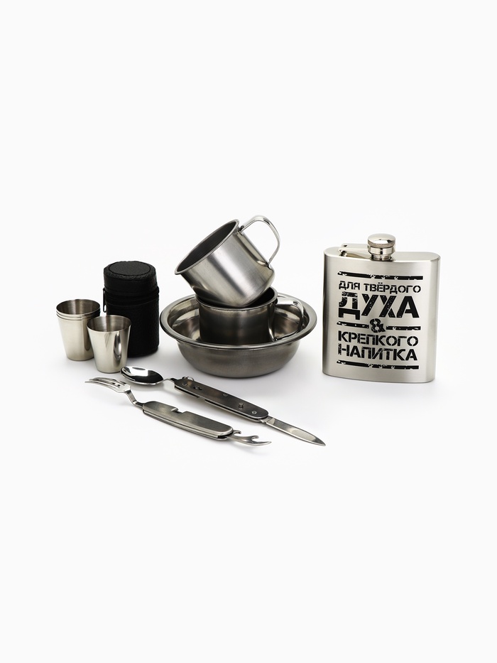 Составляющие набора: Мультитул, Рюмки (стопки), Кружка, Фляжка, Тарелка