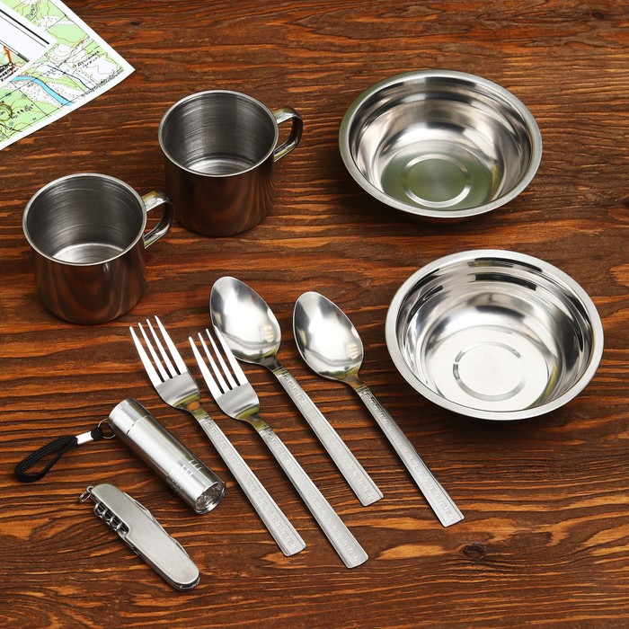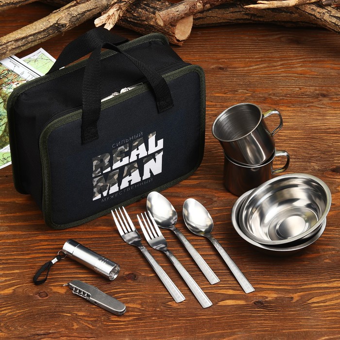 Составляющие набора: Сумка, Мультитул, Вилка, Фонарик, Ложка, Кружка, Тарелка