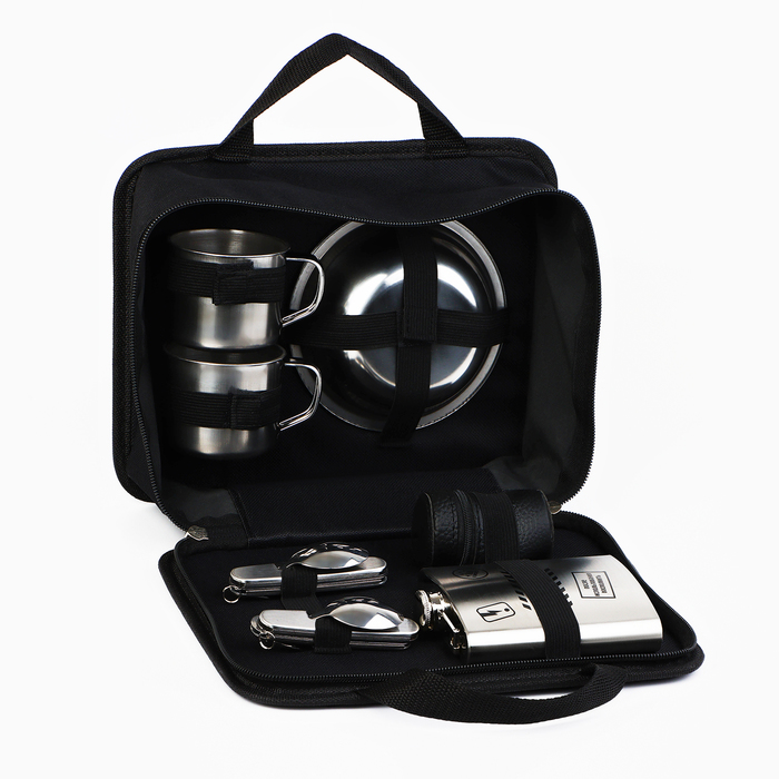 Составляющие набора: Тарелка, Рюмки (стопки), Фляжка, Мультитул, Кружка