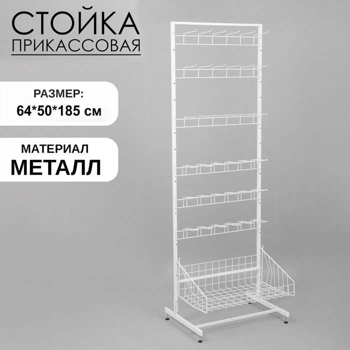 Стойка прикассовая, с 6-штыревой гребенкой и крючками, 64×50×185 см, белая
