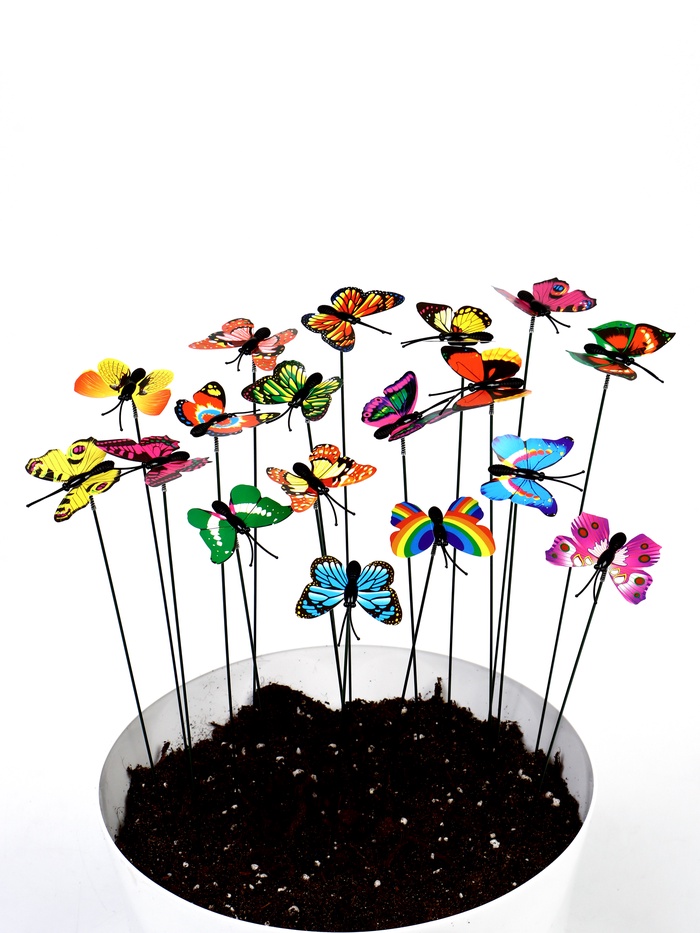* Расширенный комплект: в наборе находится двадцать пять штекеров с бабочками. Количество позволяет создавать плотные скопления декора — хватает на оформление нескольких крупных клумб или многочисленных горшков.