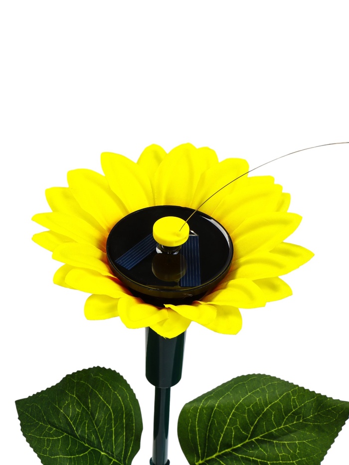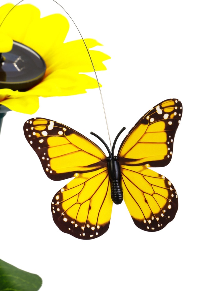 * Движение от солнечной энергии: встроенная солнечная панель заряжает устройство в дневное время. После зарядки бабочка начинает плавное вращение вокруг жёлтого подсолнуха.
