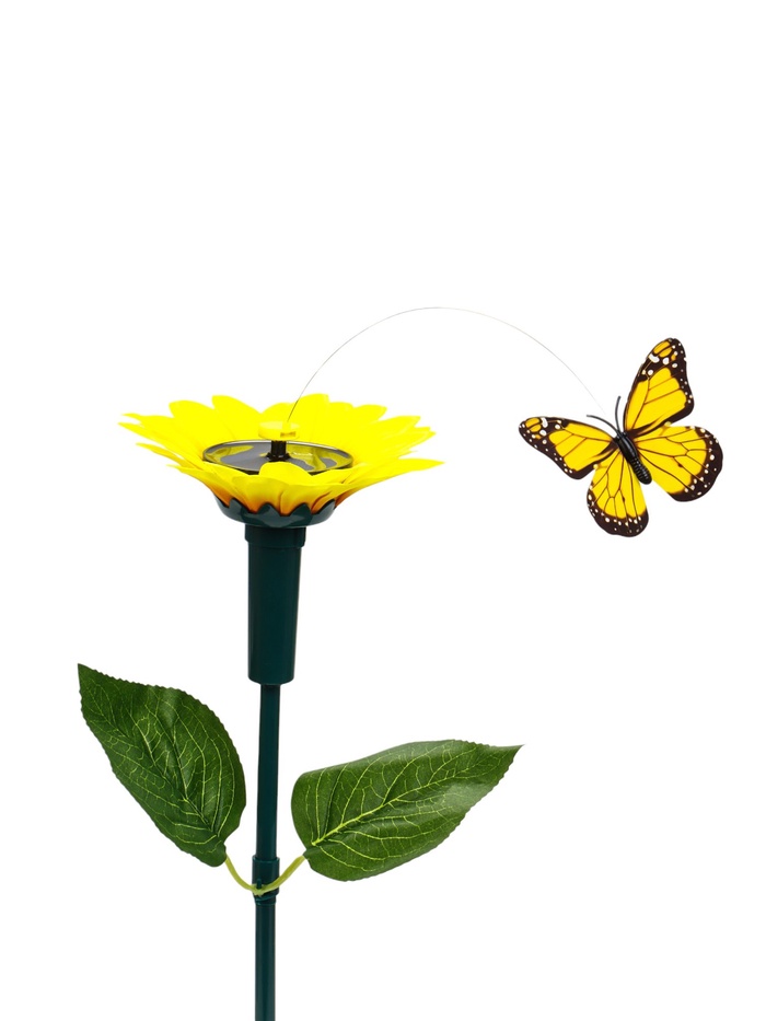 Штекер декоративный «Подсолнух с бабочкой» на солнечной батарее — это элемент садового декора для установки в горшки и клумбы. Устройство создаёт подвижную композицию: яркая бабочка кружится вокруг цветка подсолнуха.