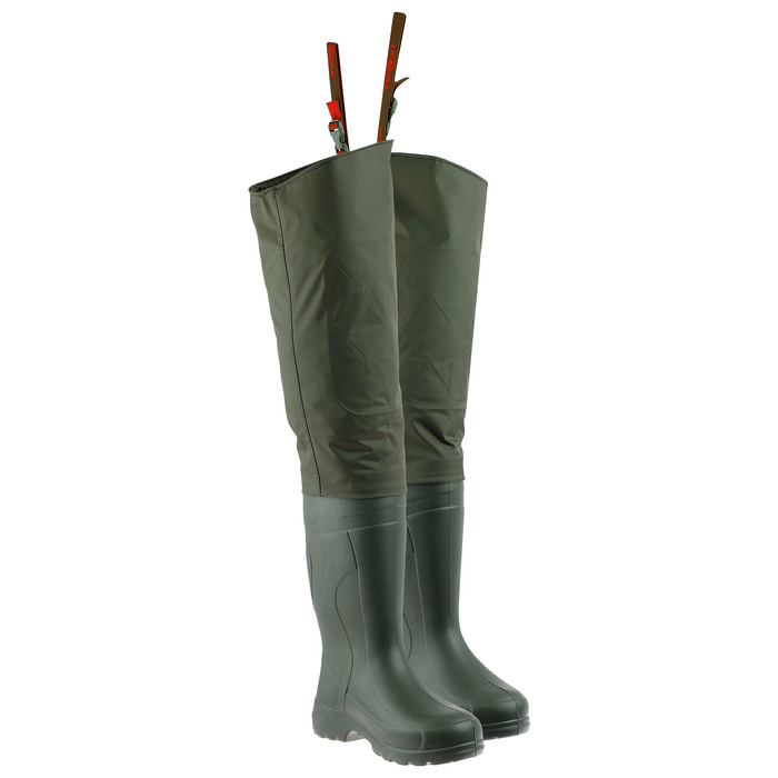 Болотники выполнены на базе модели TORVI универсал. К сапогу из материала ЭВА герметично прикреплён верх из нейлона с ПВХ покрытием. Имеют комфортную колодку. Просторное голенище сапога и специальная засечка на пятке позволяют легко снимать сапоги. Специальные наплывы из ЭВА защищают нос и пятку от случайных ударов.