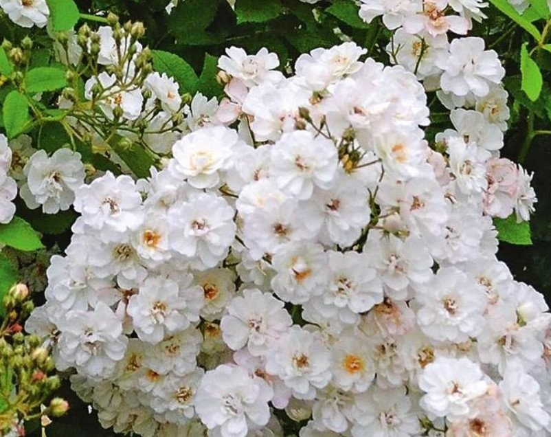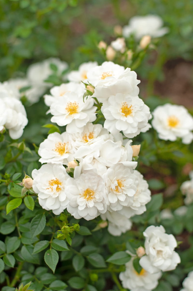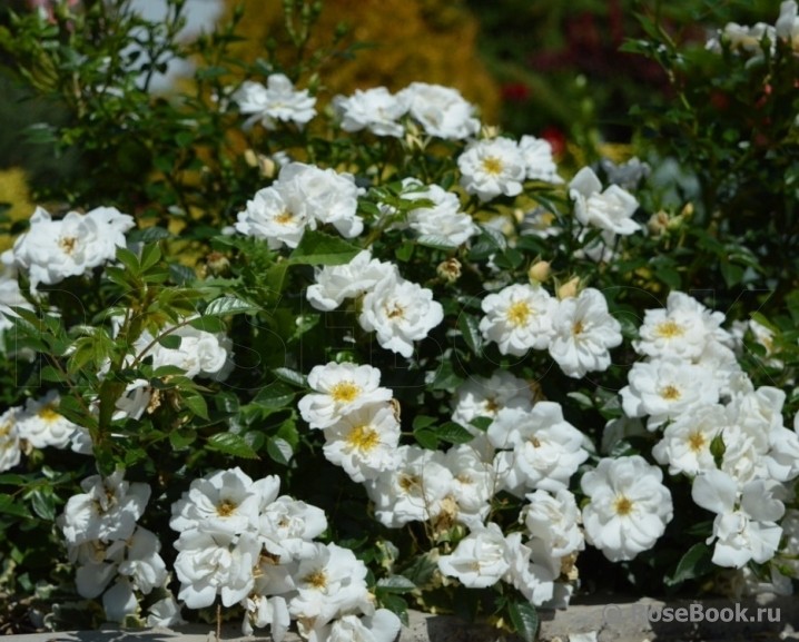 Роза почвопокровная Биненвайде Вайс. Цветки диаметром 2-4 см, полумахровые, белоснежные с заметными жёлтыми тычинками, в больших соцветиях, привлекательны для пчёл и шмелей. Цветение повторное. Куст высотой 30-50 см, растёт как типичная компактная патио-роза. Особенно хорошо смотрится в посадке с другими сортами из серии «Bienenweide». Рекомендуется как контейнерное растение для террас, для посадки маленькими группами, для обсадки насаждений по периметру.