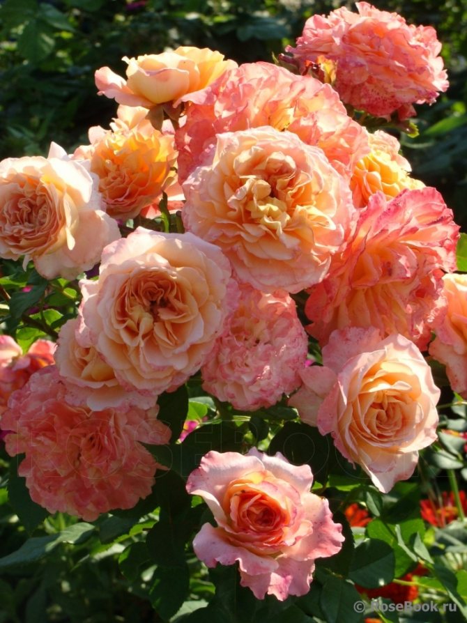 Дополнительно: Сорт с крупными цветками ностальгической формы. Цветки густомахровые, пышные, необычной розово-персиковой окраски. Лепестки очень нежные, могут повреждаться дождем и ветром, однако это компенсируется обильным цветением. В зависимости от степени освещенности участка и кислотности почвы окраска цветков сорта может меняться на более или менее интенсивную. Молодые бутоны в фазе полуроспуска можно использовать для срезки в качестве компонента букетов. Куст сильнорослый, раскидистый. Аромат цветков хорошо ощущается на расстоянии, он насыщенный, сладкий, фруктовый с нотками малины. Сорт неплохо устойчив к заболеваниям, но во второй половине лета требует профилактических обработок против черной пятнистости.