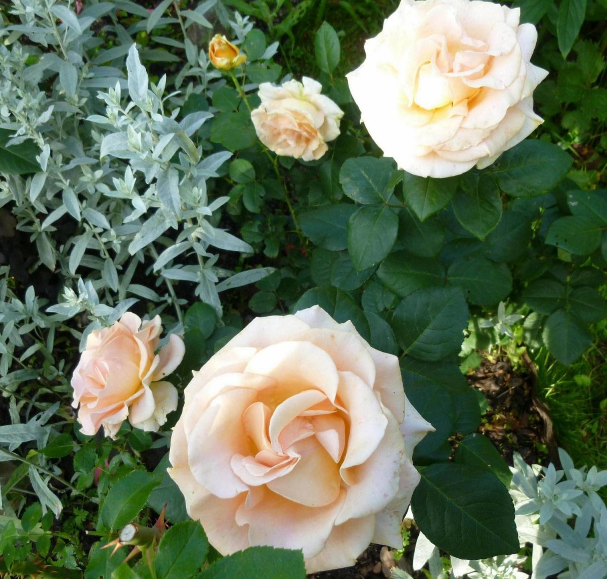 Изысканная форма цветков. Образует аккуратные кусты округлой формы, сильнорослые, хорошо разветвленные. Листва темно-зеленая с бронзовым отливом. Цветы среднемахровые, крупные, кремово-абрикосового цвета. Отлично растет на солнечных участках, хорошо переносит дождь и морозы. Имеет высокий иммунитет к основным заболеваниям. Используется для групповых посадок и срезки, сохраняя свежесть до 10 дней.