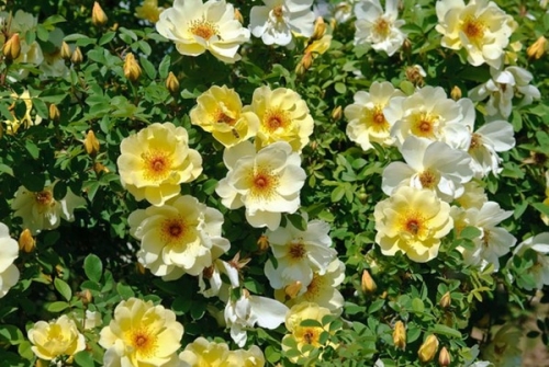 Цветки Fruhlingsgold обычно появляются по одному или в коротких кистях на концах изогнутых побегов прошлогоднего роста. Буйное цветение создает впечатление, что растение покоряется под тяжестью этих красавцев. Зимостойкая и выносливая роза, Fruhlingsgold чувствует себя комфортно в прохладном климате.