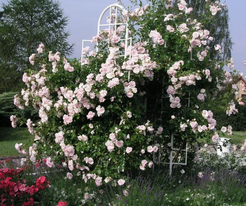 New Dawn чаще всего продают как плетистую вьющуюся розу (рамблер). Однако этот сорт можно использовать самыми разными способами: выращивать как рыхлый фонтановидный куст, формировать как шраб, создавать живую изгородь или, учитывая ее невероятную плетистость, использовать в вертикальном озеленении. В последнем ей мало равных: плетистые побеги с густой темной листвой и на этом зеленом фоне россыпь нежнейших цветов с легкостью покрывают большие площади, в том числе скрывая некрасивые постройки или недостатки стен, колонн и других опор.