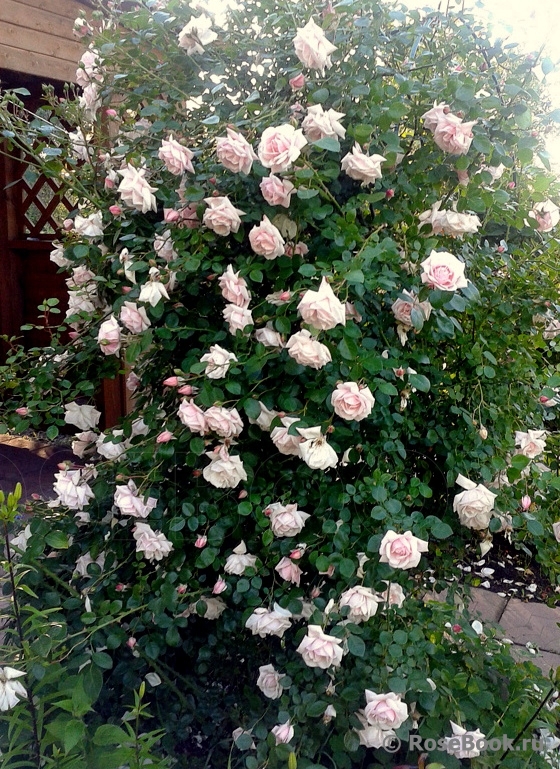 Цветки крупные, полумахровые, чашевидные, диаметром до 8 см. Бутоны очень элегантные, плотные, серебристо-розового цвета, раскрываются нежнейшие жемчужно-розовые цветы, к моменту отцветания могут выцветать почти до белого. В процессе самого цветения очень стойко переносят капризы природы: сохраняют свой цвет под палящими лучами солнца и не портятся под проливным дожем.