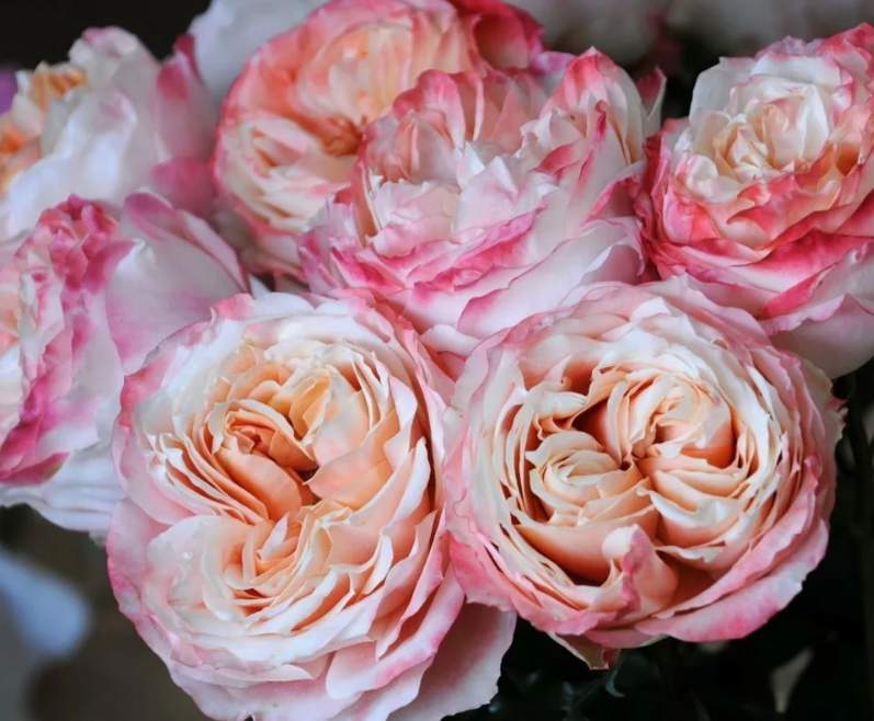 Описание: Крупные густомахровые цветки, состоящие из 80 и более лепестков, напоминают пионы. Окрас лепестков от нежно-розового и белого до персикового. Аромат очень нежный и легкий, приятный. Цветение повторное. Куст компактный, прямостоячий. Лист темно-зеленый, глянцевый. Устойчивость к болезням хорошая, бутоны могут повреждаться сильным дождем.