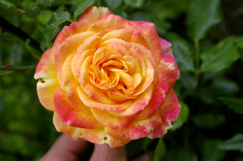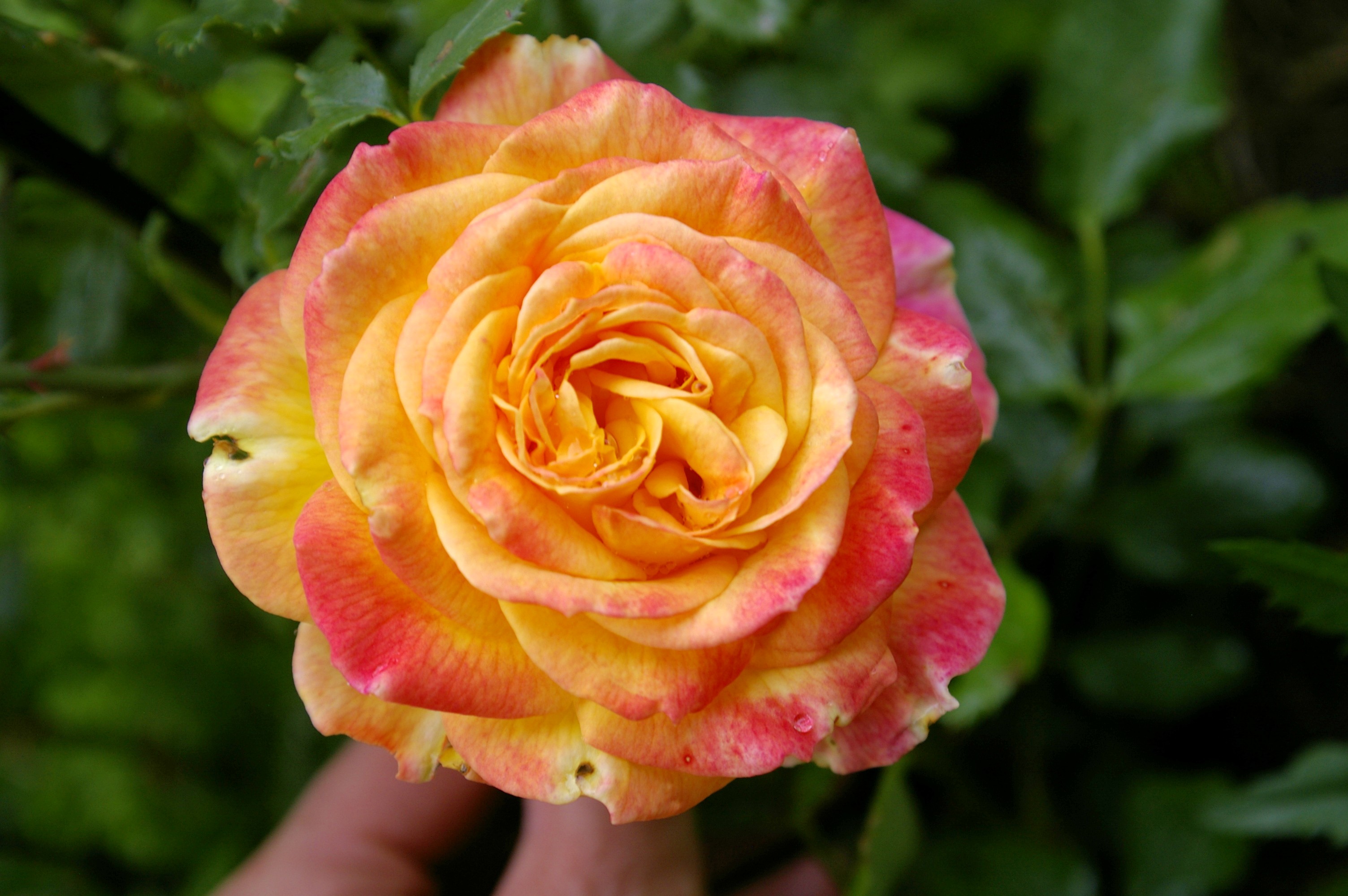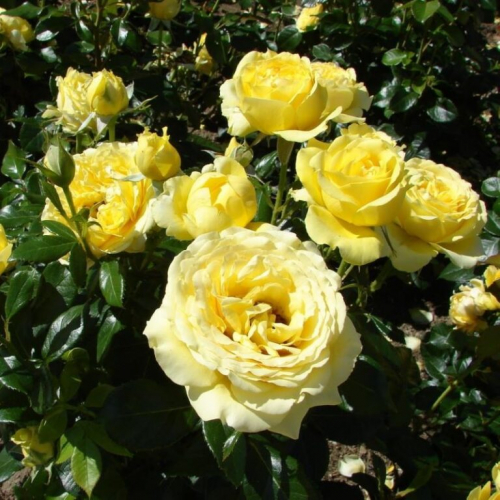 Роза Метеор флорибунда, Топалович - цветки огненно-оранжево-красные, яркие, хорошие формы, средние (6—7 см), махровые (42 лепестков), слабо душистые, в соцветиях (до 10). Кусты низкие, компактные. Листья кожистые. Цветение обильное.