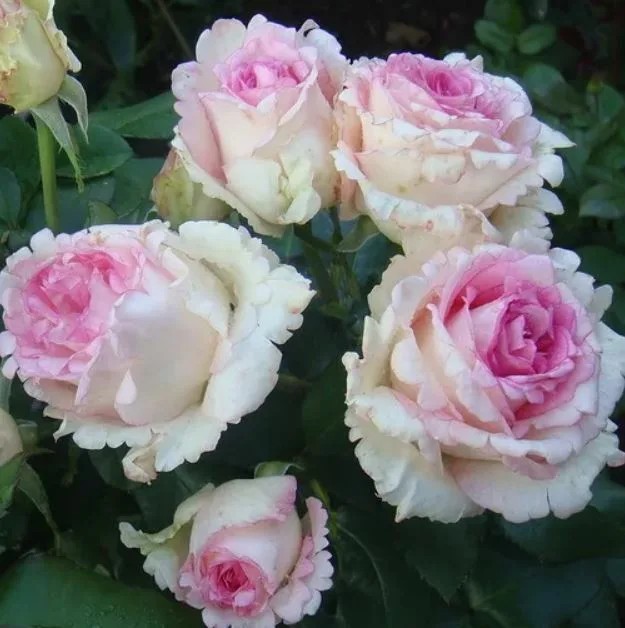 Высота растения 0.9 - 1.0 м. Цветки розово--кремовые, край лепестка розовая, бутоны желто-розовые, спиральная укладка, 40-45 лепестков, 11 см, край зубчатый, с ярким мягким ароматом, одиночные. Листва яркая, зеленая. Побеги одиночные, повторноцветущие.