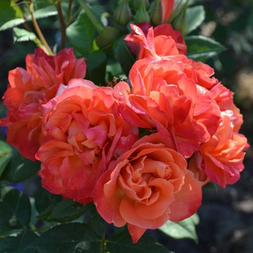 Флорибунда. Цветок ярко оранжево-красный с перламутрово-розовым оттенком, в прохладную погоду и осенью становится очень ярким, чашевидный с высоким центром, махровый, 17-25 лепестков в одном цветке, диаметр цветка 6-9см, обладает лёгким ароматом. Образуют на кусте соцветия по 5-10 цветков. Куст компактный, густой, с прямостоячими побегами, размер куста 70 на 60см, лист зеленый, средний, полуглянцевый. Цветок выносливый, устойчивый к различным погодным условиям._x000D__x000D_Поставка: весна 2026г.
