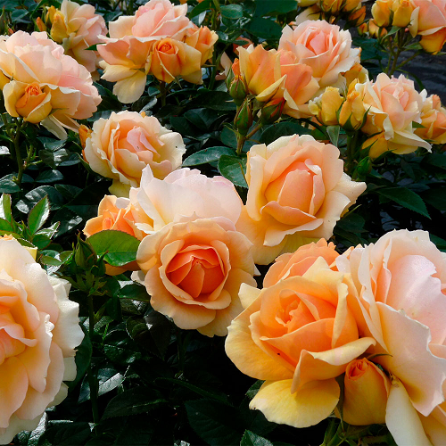 Флорибунда. Куст средней высоты, полураскидистый, побеги достигают длины 60-80см, прочные, с высокой энергией роста. Растение компактной формы, разрастается до 50см. Листья среднего размера, густо-зеленые, глянцевые. Бутоны бокаловидные медово-желтые с персиковым оттенком. Цветки среднего размера, достигают 8см диаметром, чашевидной формы, махровые, содержат до 40 лепестков. Абрикосово-оранжевые в сердцевине и нежно-желтые по краям, лепестки по краю волнистые, серединку цветок приоткрывает только на 7 день. На стебле образуется сразу 4-5 бутонов, цветение букетное. Аромат слабый, пряный, с нотами лимона и меда._x000D__x000D_Поставка: весна 2026г.