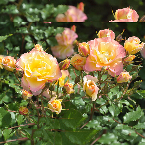 Шраб. Дает кусты с растущими прямо вверх побегами. В высоту они достигают 1,1-1,3м. По сравнению с другими розами отличается чуть большей шириной — не 0,6м, как обычно, а 0,8м. Темно-зеленая листва достигает средней величины. На кусте развиваются оранжевые с переходом в насыщенный красный цвет бутоны. Сами цветки имеют абрикосово-желтую окраску. К ней примешивается розовый оттенок, а край лепестка имеет малиновую поверхность. Распускаясь, это растение приобретает желтый цвет. Края лепестков при этом получают темный розовый окрас. Хотя растение и является двухцветным, но пестрота для него не характерна. Бутон похож на яйцо, а сам цветок визуально напоминает розетку. В поперечнике цветы достигают 7-9см. Отмечается умеренная махровость, которая обеспечена за счет 19-26 лепестков. Сами цветы группируются в соцветия, и на 1 стебель их может приходиться от 3 до 5 штук.