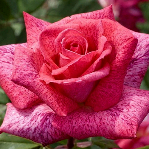 Чайно-гибридная. Куст формируется весьма компактным, его высота составляет в среднем 80-90см, а ширина кроны не превышает 50см. Листья среднего размера, небольшие, имеют темно-зеленый окрас. А также на листе присутствует небольшая глянцевость, которая заметна при попадании солнечных лучей на листву. Бутоны розы отличаются насыщенным и ярким цветом. У самой розетки лепестки имеют темно-розовый насыщенный оттенок, а ближе к краю проявляется малиновый подтон со звездной пылью. Благодаря этой небольшой пыли цветок становится пёстрым, но при этом не имеет двухцветность. По форме розетка бокаловидная, а сам цветок – чашевидный с высоким центром. Размер бутона крупный, его диаметр составляет 10-12см. По типу цветок относится к среднемахровым сортам и имеет 30-35 лепестков. На одном стебле формируется только 1 цветок, поэтому тип соцветия у розы – одноцветковой. Аромат - очень сильный и стойкий. Некоторые говорят, что он похож на майскую розу с очень тонким и насыщенным запахом.