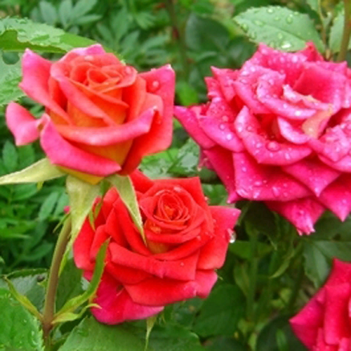 Флорибунда. Окрас роз может быть самым разным. Они могут быть либо однотонными, либо двухцветными, но цвет лепестков всегда яркий и насыщенный. Аромат розочек нежный и очень легкий. На кусте эти розочки появляются в соцветиях. Растение имеет светлую листву. Характер цветения роз волнообразный, каждый раз оно сопровождается дружным распусканием бутончиков, отчего высокий и сильный куст в мгновение ока превращается в одно сплошное яркое облако. Кустарник высотой до 0,5м, растет густо. Средняя устойчивость к мучнистой росе и черной пятнистости. Средняя устойчивость к дождю. Повторноцветущая.