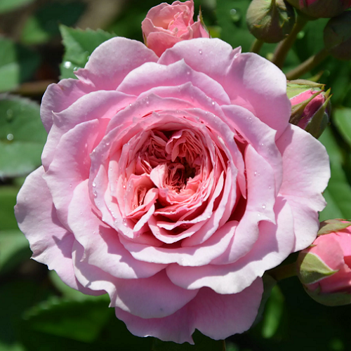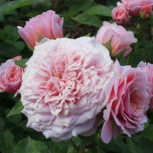 Шраб. Сорт представляет собой сильнорослый кустарник с прямостоячими побегами. Высота здорового взрослого растения в среднем достигает 110-150см, ширина у него в среднем составляет 100см. Листья на кустарниках насыщенной зеленой расцветки. Размер у них средний. Цветки обладают красивым нежно-розовым цветом, центральная часть у них, как правило, окрашена в нежно-абрикосовый. Все цветки имеют розетковидную форму, размеры у них средние. Диаметр каждого из них составляет по 6-8см. Эта роза является густомахровой. Распустившиеся цветки могут располагаться на стебле одиночно либо собираться в отдельные соцветия. Они хорошо держат свою форму и не распускаются. Растение имеет приятный цитрусовый аромат с оттенками мирры и маракуйи. Интенсивность аромата средняя.