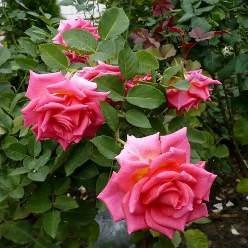 Чайно-гибридная. Махровые (около 40 лепестков) цикламеново-розовые цветки в диаметре 10см, замечательная бокаловидная форма, долго продолжается цветение отдельно взятого цветка (до трех недель), высота куста около 80см, ширина 70см. Устойчива к болезням и морозам. Красота как самих бутонов, так и стеблей с листвой указывают на то, что сорт был выведен для срезки. Букет из таких цветов просто изумителен, цветы долго не вянут и не теряют своего чудесного аромата. Высаживая эту розу в саду, где растет много других декоративных растений, лучше найти ей место с более низкими цветами. В саду эта роза чувствует себя отлично. Цикламеново-розовые с абрикосовыми оттенками, средне махровые (около 35 лепестков) цветки классической формы чайно-гибридной розы. Куст компактный средне-рослый, с ярко-зеленой листвой и малым количеством шипов.