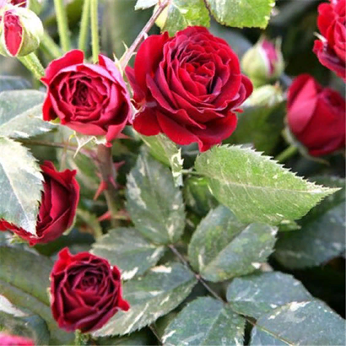 Чайно-гибридная. Куст высотой 120-150см, шириной 60см. Роза отличается необычной вариегатной листвой, цветки красные с черными бархатными тенями, махровые. Аромат лёгкий. Повторноцветущая. Цветки устойчивы к жаре и солнцу. Мощный куст хорошо подходит для живых изгородей. Сорт очень устойчивый к засухе и болезням, лёгкий в выращивании.