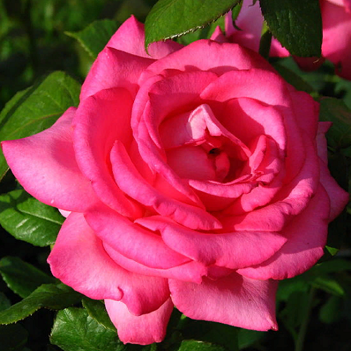 Чайно-гибридная. Роза с крупными соблазнительными махровыми цветками насыщенного сверкающего розового цвета, благородной классической формы с нежным запахом малины. Цветет одиночными цветками или гроздьями. Глянцевая крупная листва, длинные, крепкие стебли. Цветы идеальны для составления букетов. Высота куста - от 75 до 185см, ширина - 60см.