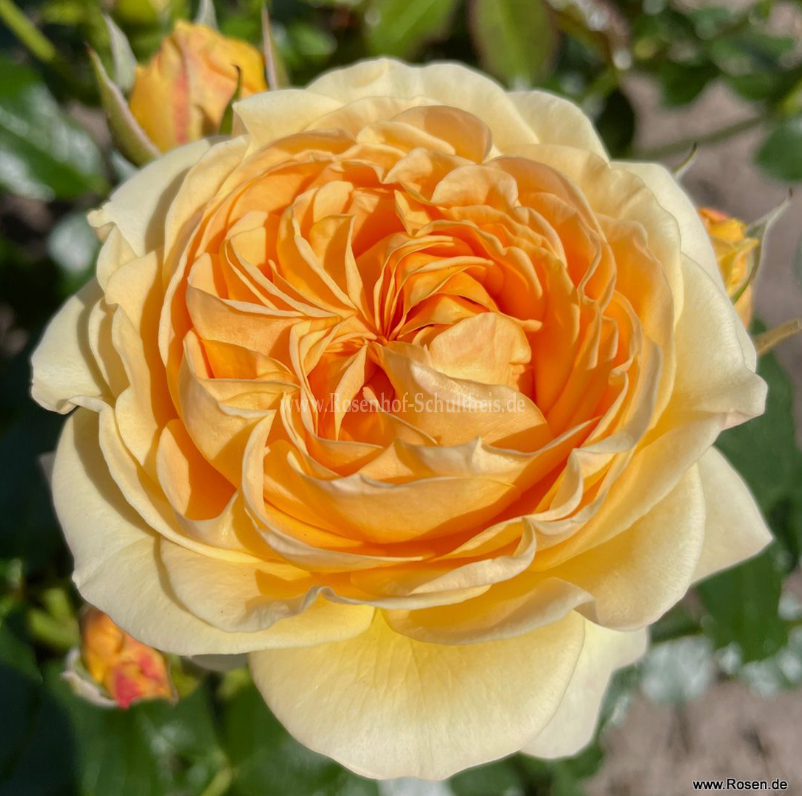 Цветы романтического вида, чашевидные, диаметром 8 см, состоят из 25 закрученных, слегка ароматных, золотисто-желтых лепестков. Цветение постоянными повторами, обильными гроздьями. Роза красива даже когда увядает и производит впечатление здоровья даже в сильную жару.
