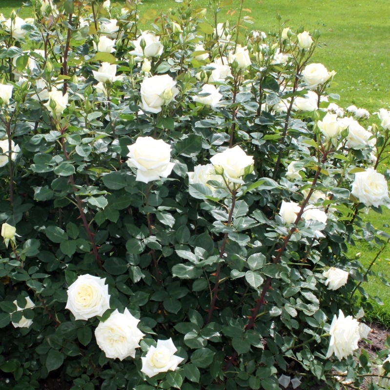 Кремовые бутоны этого сорта распускаются в крупные бокаловидные цветки на длинных прочных побегах. Роза обращает на себя внимание в саду, частично благодаря окраске, частично из-за обильности цветения. Для клумбы, где нужен крупный куст, это будет хороший выбор. Аромат почти отсутствует, но цветки переносят влажную погоду лучше большинства белых сортов и долго цветет. Куст высокий, прямостоячий, листва темная, матовая.