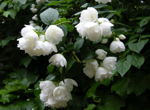 Кустарник с густо расположенными овальными, светло-зелеными листьями. Осенью листья приобретают красивую красновато-жёлтую окраску, чем притягивают взоры прохожих. Цветки снежно-белые, полумахровые и махровые, иногда почти простые, крупные до 5,5см, с широкими, отстоящими лепестками, слегка волнистыми по краям. Внутренние лепестки более узкие, немногочисленные. Очень душистые цветы собраны по 7-9 шт. в длинные плотные кисти до 11см, образующие султаны до 50см длиной. Цветет в июне-июле обильно, на протяжении 3- 6 недель.