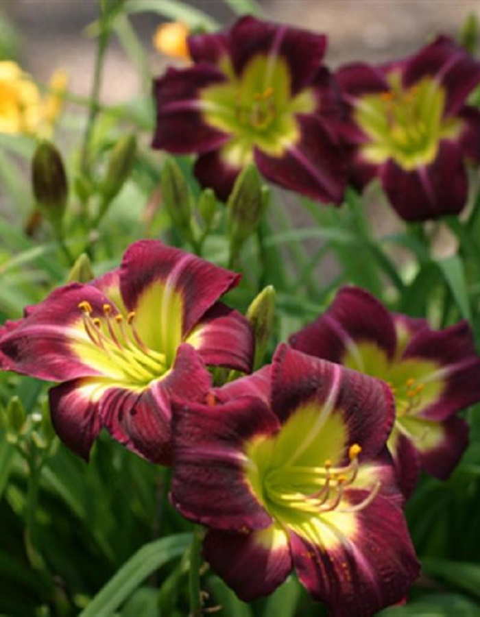 Окраска цветка : яркого бордово-фиолетового цвета с большим желтым центром