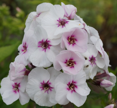 Сиренево-розовый с красноватым колечком, яркий. Соцветия небольшие, довольно плотные. Быстро разрастается, неприхотливый.