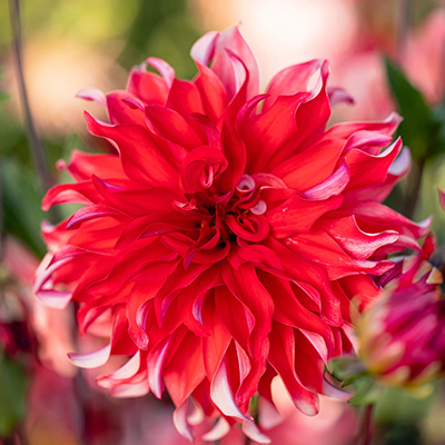 Многослойный огненно-красный цветок. Обратная сторона лепестков слегка серебристая. За счет контраста цвета и изогнутых лепестков создаётся легкий эффект волны. Диаметр цветка до 20 см