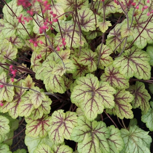 Компактный, плотный кустик 15 см высотой и 35 см шириной. Листь яркие красно-коричневых с вишневым оттенком. С возрастом листья приобретают оранжевые добавки в окраске, а потом желтоватые. Мелкие колокольчатые вишнево-красные цветы собраны в продолговатую метелку на высоком цветоносе (45 см)
